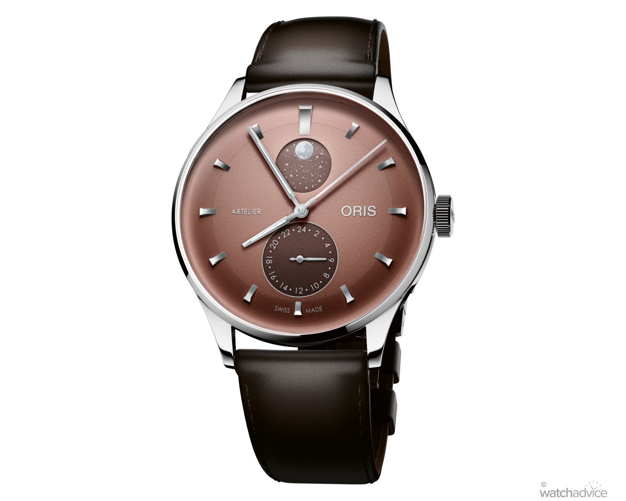 Of the three, the chestnut brown rendition is perhaps the most visually contrasting, but it still avoids tipping into flamboyance. Branding is kept restrained, with the “ORIS” logo balanced on one side of the dial and the model designation on the other, establishing a clear, metropolitan identity.