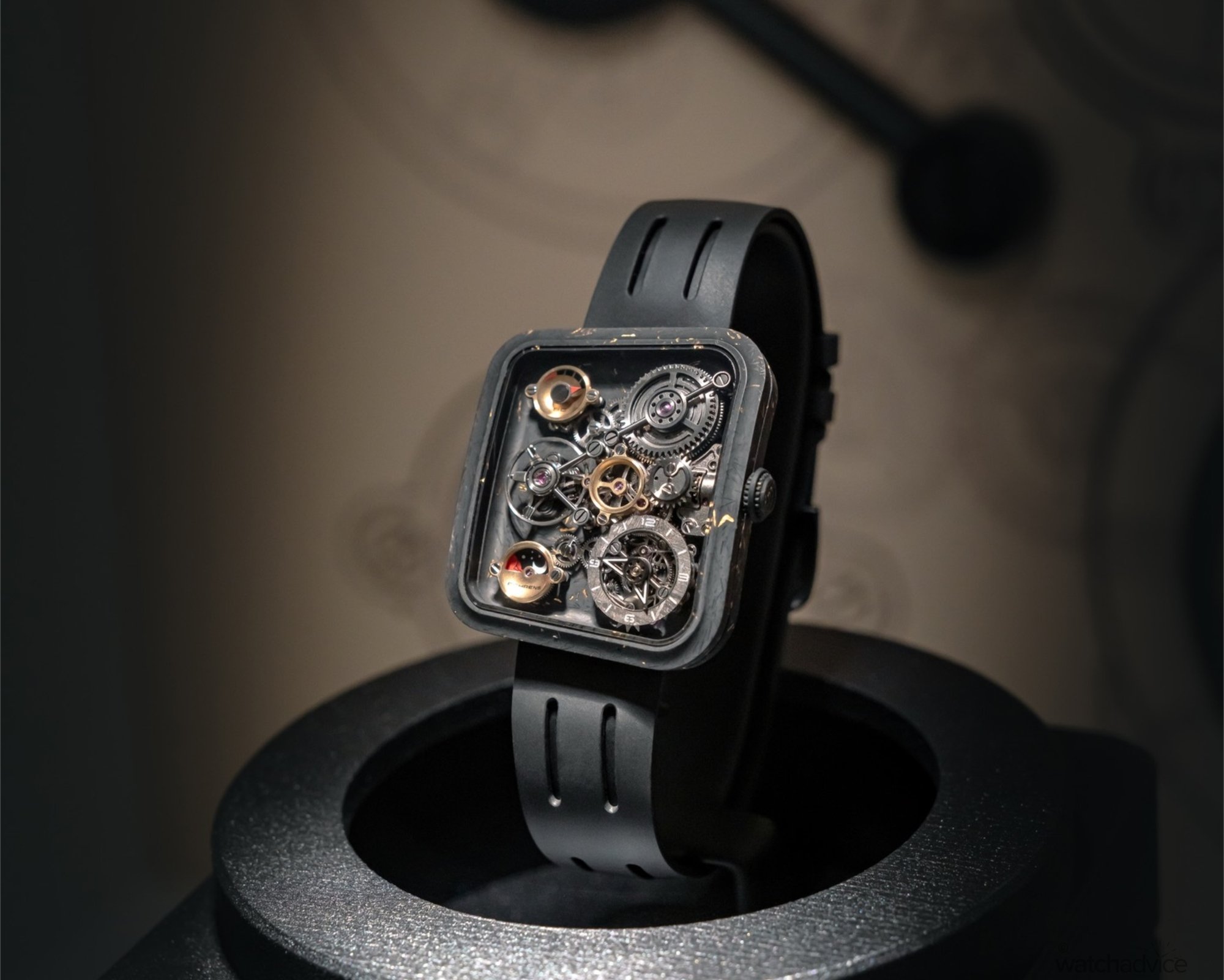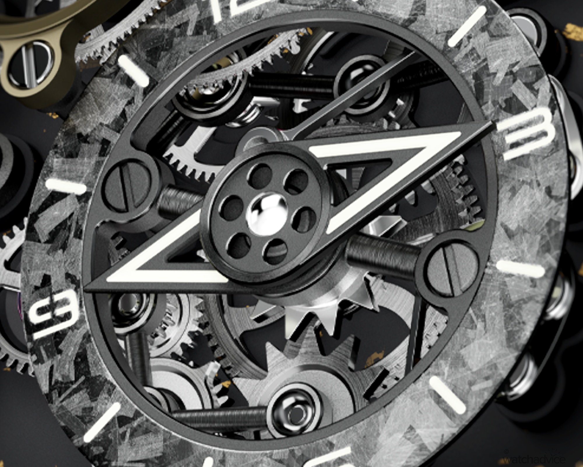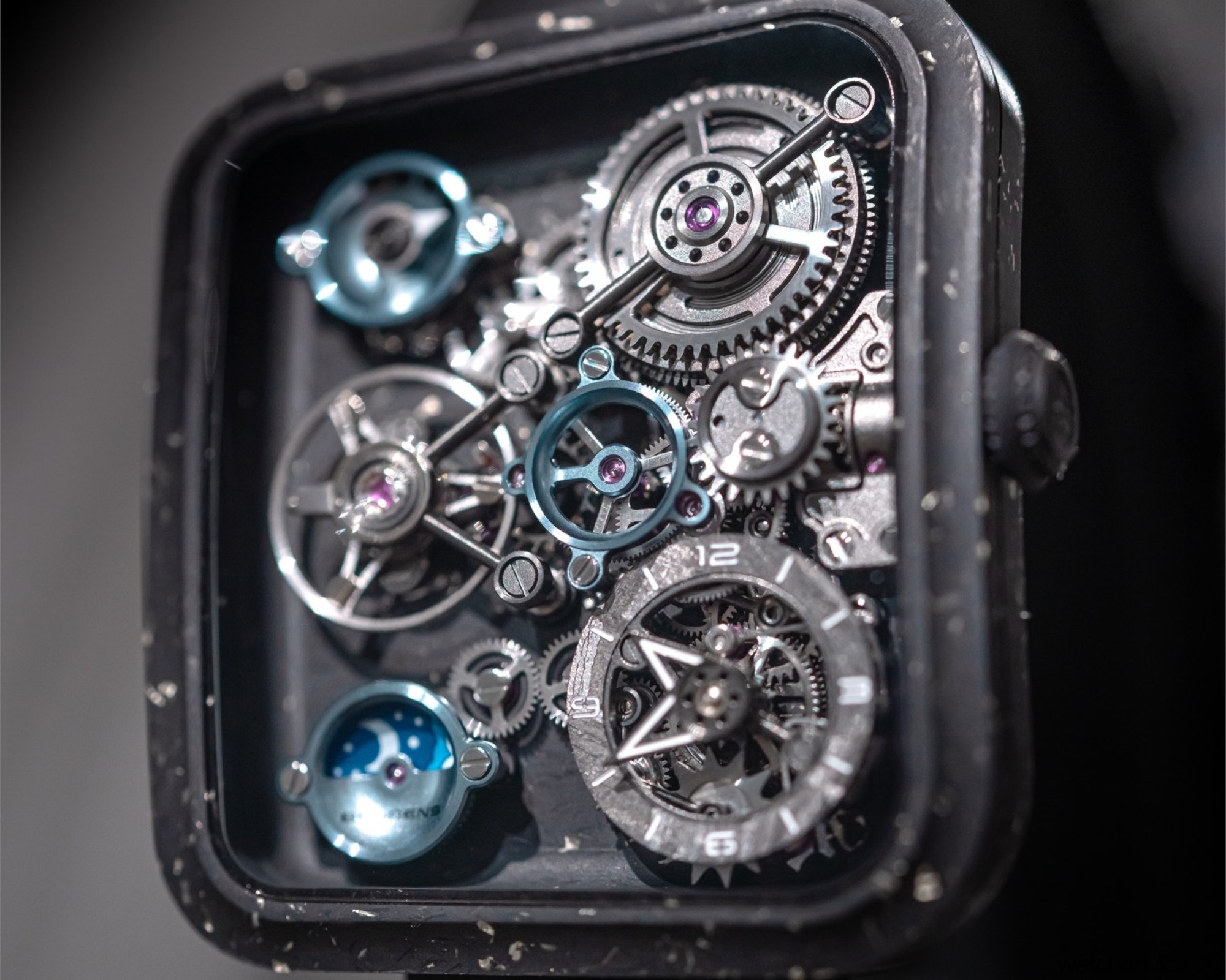 The graphene models incorporate either gold leaf or platinum leaf, creating a contrast between warmth and cool metallic precision. The titanium versions expand the palette, with finishes in Frost Silver, Obsidian Black, Meteorite Grey and Matte Black. As a whole, the watch departs entirely from conventional dial design. The openworked display reveals the movement in full, while a meteorite chapter ring frames it all, adding texture and depth.