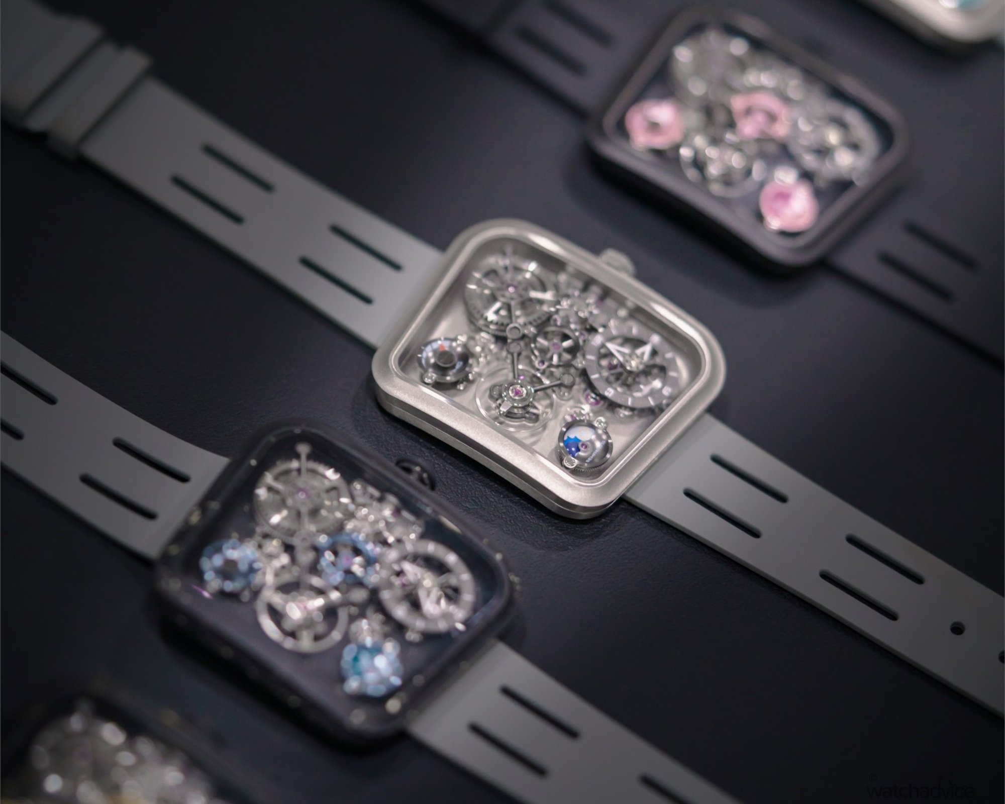 | Dial | Openworked grey / with frost blue accents Openworked black with pink accents |