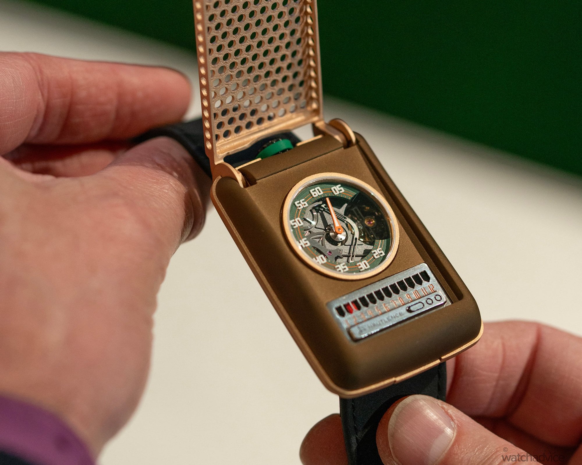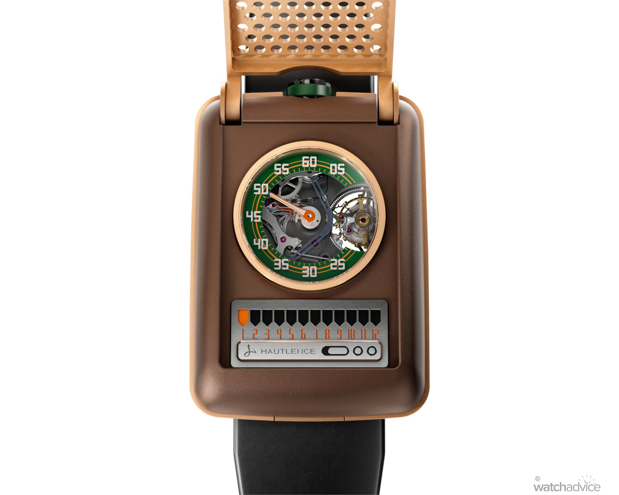 Hautlence’s latest expansion to the series is the Retrovision ‘64, which takes inspiration from the iconic communicator device from, well, a certain science fiction series that was hugely popular at the time. Measuring 41.8mm wide, a whopping 61.2mm long and 15.6mm thick, it is encased in grade 5 titanium with red gold and brown PVD. To check the time, however, you first have to flip the cover open. Once you do, you are greeted with a delightfully retro-futuristic dial design that mimics the layout of the communicator.