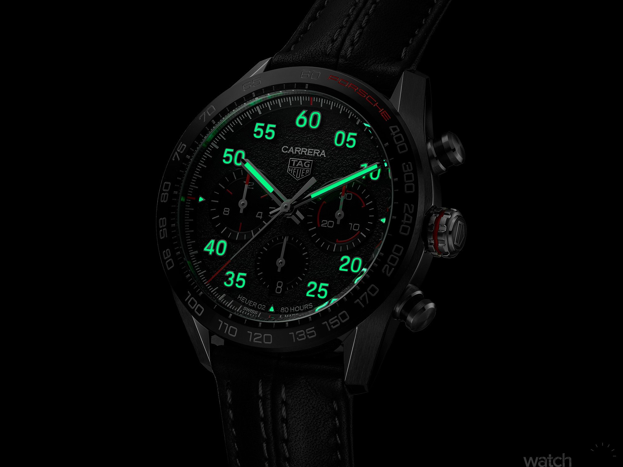 The engine inside the Carrera Porsche Chronograph is TAG Heuer’s own Calibre Heuer 02 manufacture movement. This Calibre Heuer 02 movement has a frequency of 28,800 VpH (4 Hz) and can produce a power reserve of approximately 80 hours. The watch also comes with an open case back in which you can see the specially redesigned oscillating mass in the shape of Porsche’s celebrated steering wheel. The oscillating mass has printed on it “Porsche” and “TAG Heuer” to show the collaboration.