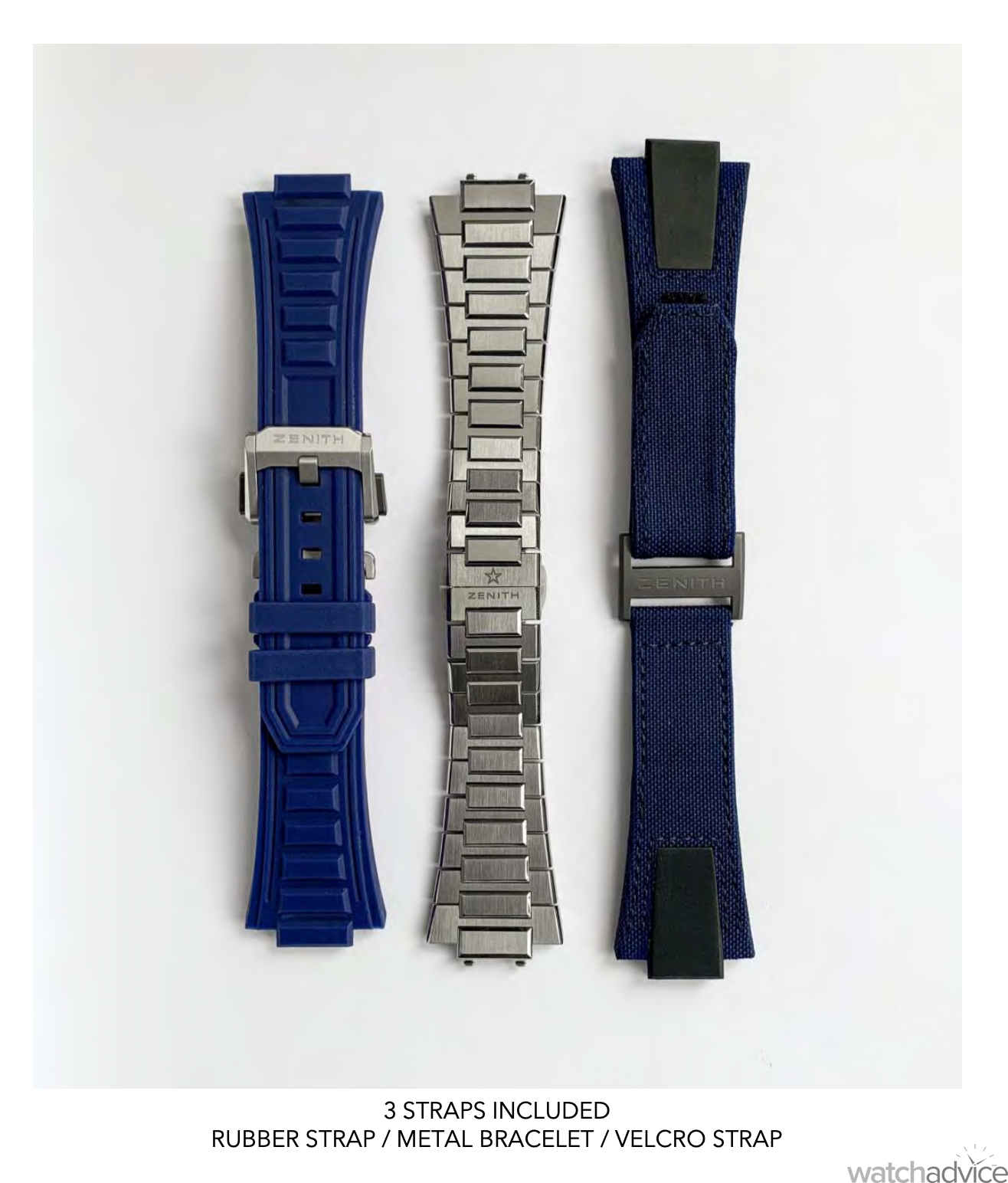 The DEFY Extreme models are equipped with the quick strap-change system and come with three different straps options; a micro-blasted or polished and satin-brushed titanium bracelet, a rubber strap with a folding buckle matching the case, and a very first for Zenith, a Velcro® strap that can be easily and precisely adjusted on the go, with the textile material perfectly suited for any situation.